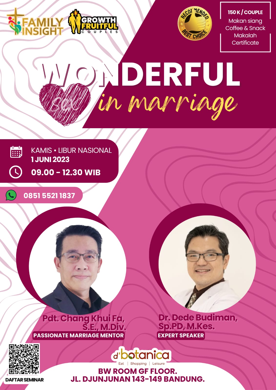 Jangan lewatkan sebuah seminar yang akan MENGOKOHKAN relasi Anda berdua & memaparkan penyingkapan terdalam tentang KEINDAHAN SEKS dalam PERNIKAHAN, bersama PDT. CHANG KHUI FA, S.E., M.DIV. & DR. DEDE BUDIMAN, SP.PD, M.KES.